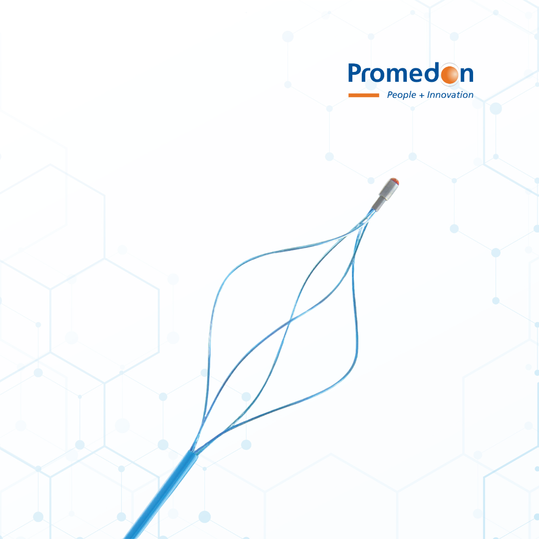 Dispositivo de extracción de cálculos renales compuesto por un mango, una vaina y una cesta colectora de cálculos. La canastilla con punta está conformada por 4 hilos helicoidales.