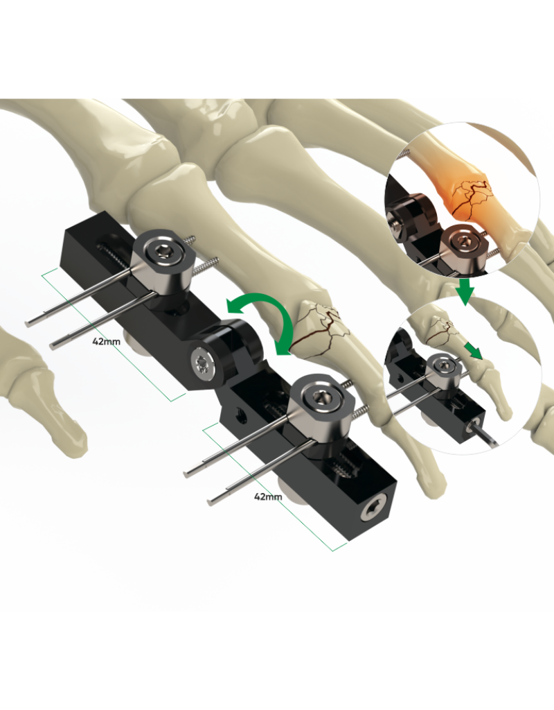 Sistema de fijación temporal de fracturas, pseudoartrosis, consolidación defectuosa, osteotomías de huesos metacarpianos y metatarsianos. Artrodesis de articulaciones metacarpofalángicas y metatarsofalángicas. Especialmente utilizado para la fijación de fracturas abiertas, con fines de alargamiento de huesos metacarpianos y metatarsianos.